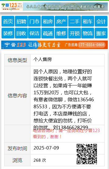 因个人原因,地理位置好的连锁快餐出兑,两个人就可以经营,如果肯干一年能赚15万到20万,也可以大包,有意者微信聊,微信13654685533,因为不方便请不要打电话,本店是赚钱的店,想捡大便宜的勿扰,打听价的勿扰。刘13846628299 【电话咨询时,请一定说明在伊春信息网看到的,谢谢!】 |