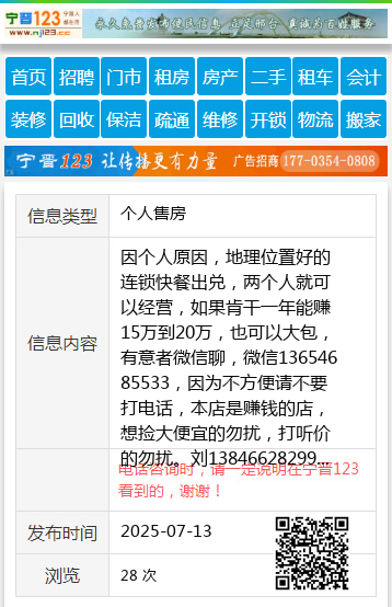 因个人原因,地理位置好的连锁快餐出兑,两个人就可以经营,如果肯干一年能赚15万到20万,也可以大包,有意者微信聊,微信13654685533,因为不方便请不要打电话,本店是赚钱的店,想捡大便宜的勿扰,打听价的勿扰。刘13846628299 【电话咨询时,请一定说明在伊春信息网看到的,谢谢!】 |