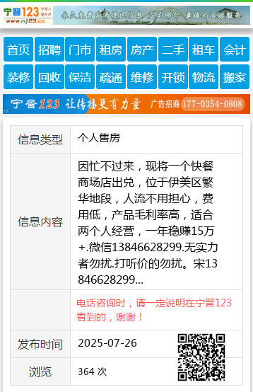 因忙不过来,现将一个快餐商场店出兑,位于伊美区繁华地段,人流不用担心,费用低,产品毛利率高,适合两个人经营,一年稳赚15万+.微信13846628299.无实力者勿扰.打听价的勿扰。宋13846628299 【电话咨询时,请一定说明在伊春信息网看到的,谢谢!】 |