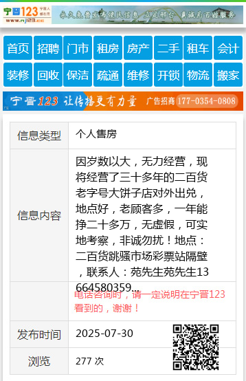 因岁数以大,无力经营,现将经营了三十多年的二百货老字号大饼子店对外出兑,地点好,老顾客多,一年能挣二十多万,无虚假,可实地考察,非诚勿扰!地点:二百货跳骚市场彩票站隔壁,联系人:苑先生苑先生13664580359 【电话咨询时,请一定说明在伊春信息网看到的,谢谢!】 |