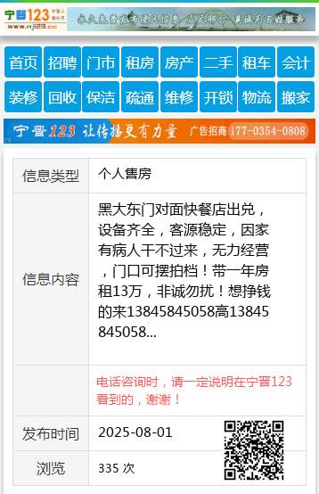 黑大东门对面快餐店出兑,设备齐全,客源稳定,因家有病人干不过来,无力经营,门口可摆拍档!带一年房租13万,非诚勿扰!想挣钱的来13845845058高13845845058 【电话咨询时,请一定说明在伊春信息网看到的,谢谢!】 |