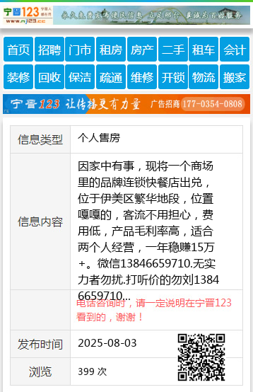 因家中有事,现将一个商场里的品牌连锁快餐店出兑,位于伊美区繁华地段,位置嘎嘎的,客流不用担心,费用低,产品毛利率高,适合两个人经营,一年稳赚15万+。微信13846659710.无实力者勿扰.打听价的勿刘13846659710 【电话咨询时,请一定说明在伊春信息网看到的,谢谢!】 |