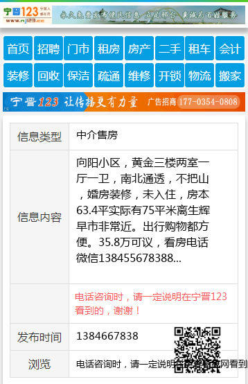 向阳小区,黄金三楼两室一厅一卫,南北通透,不把山,婚房装修,未入住,房本63.4平实际有75平米离生辉早市非常近。出行购物都方便。35.8万可议,看房电话微信138455678388