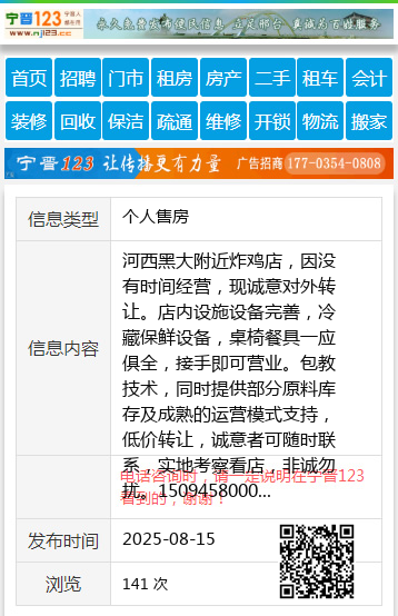 河西黑大附近炸鸡店,因没有时间经营,现诚意对外转让。店内设施设备完善,冷藏保鲜设备,桌椅餐具一应俱全,接手即可营业。包教技术,同时提供部分原料库存及成熟的运营模式支持,低价转让,诚意者可随时联系,实地考察看店,非诚勿扰。15094580005明15094580005 【电话咨询时,请一定说明在伊春信息网看到的,谢谢!】 |