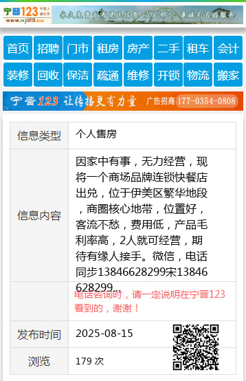 因家中有事,无力经营,现将一个商场品牌连锁快餐店出兑,位于伊美区繁华地段,商圈核心地带,位置好,客流不愁,费用低,产品毛利率高,2人就可经营,期待有缘人接手。微信,电话同步13846628299宋13846628299 【电话咨询时,请一定说明在伊春信息网看到的,谢谢!】 |