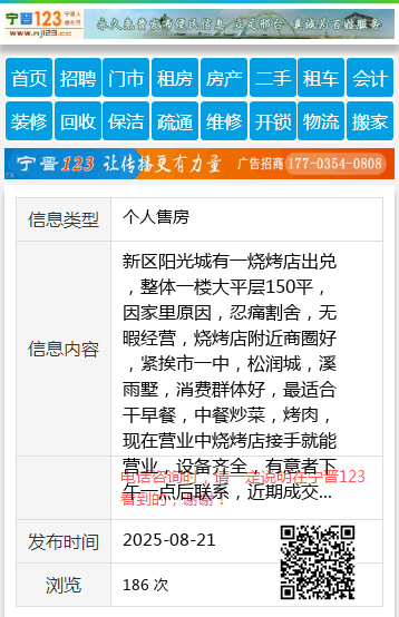 新区阳光城有一烧烤店出兑,整体一楼大平层150平,因家里原因,忍痛割舍,无暇经营,烧烤店附近商圈好,紧挨市一中,松润城,溪雨墅,消费群体好,最适合干早餐,中餐炒菜,烤肉,现在营业中烧烤店接手就能营业,设备齐全,有意者下午一点后联系,近期成交优惠,饭口勿扰,联系电话19845009099陈19845009099 【电话咨询时,请一定说明在伊春信息网看到的,谢谢!】 |