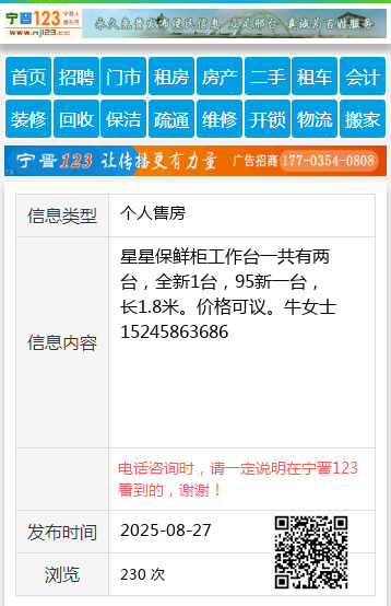 星星保鲜柜工作台一共有两台,全新1台,95新一台,长1.8米。价格可议。牛女士15245863686 【电话咨询时,请一定说明在伊春信息网看到的,谢谢!】 |