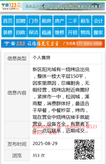 新区阳光城有一烧烤店出兑,整体一楼大平层150平,因家里原因,忍痛割舍,无暇经营,烧烤店附近商圈好,紧挨市一中,松润城,溪雨墅,消费群体好,最适合干早餐,中餐炒菜,烤肉,现在营业中烧烤店接手就能营业,设备齐全,有意者下午一点后联系,近期成交优惠,饭口勿扰,联系电话19845009099陈19845009099 【电话咨询时,请一定说明在伊春信息网看到的,谢谢!】 |