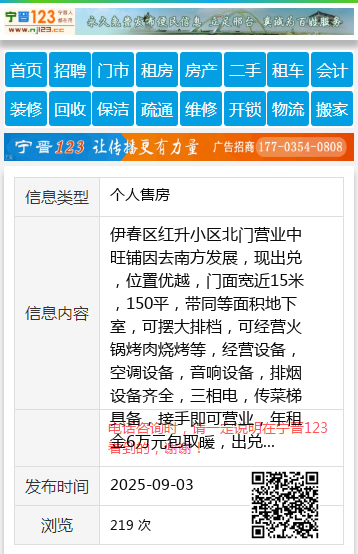 伊春区红升小区北门营业中旺铺因去南方发展,现出兑,位置优越,门面宽近15米,150平,带同等面积地下室,可摆大排档,可经营火锅烤肉烧烤等,经营设备,空调设备,音响设备,排烟设备齐全,三相电,传菜梯具备,接手即可营业,年租金6万元包取暖,出兑金15万元,有意向请电联15094545553,可到店考察,无经济实力,无诚意者勿扰。先生15204584988 【电话咨询时,请一定说明在伊春信息网看到的,谢谢!】 |