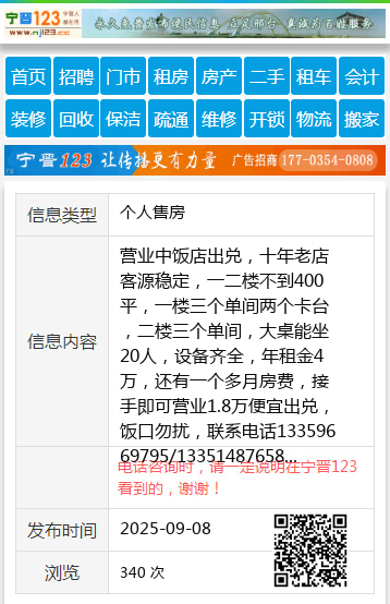 营业中饭店出兑,十年老店客源稳定,一二楼不到400平,一楼三个单间两个卡台,二楼三个单间,大桌能坐20人,设备齐全,年租金4万,还有一个多月房费,接手即可营业1.8万便宜出兑,饭口勿扰,联系电话13359669795/13351487658于先生13359669795 【电话咨询时,请一定说明在伊春信息网看到的,谢谢!】 |