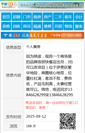 因为陪读,现将一个商场里的品牌连锁快餐店出兑,(也可以改项目)位于伊美区繁华地段,商圈核心地带,位置杠杠滴,客流不愁,费用低,产品毛利高,夫妻经营就可以。微信,电话同步13846628299宋13846628299 【电话咨询时,请一定说明在伊春信息网看到的,谢谢!】 |