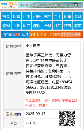 因孩子高三陪读,无精力管理,现将经营中旺铺转让,目前经营椒麻鸡,五香鸡,特色拌鸡架,各种拌菜,带技术出兑。可整体转让,也可换地区经营。电话18945456662。18617812348温18945456662 【电话咨询时,请一定说明在伊春信息网看到的,谢谢!】 |