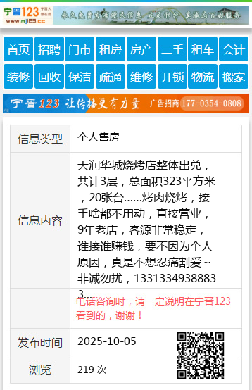 天润华城烧烤店整体出兑,共计3层,总面积323平方米,20张台……烤肉烧烤,接手啥都不用动,直接营业,9年老店,客源非常稳定,谁接谁赚钱,要不因为个人原因,真是不想忍痛割爱~非诚勿扰,13313349388833 【电话咨询时,请一定说明在伊春信息网看到的,谢谢!】 |
