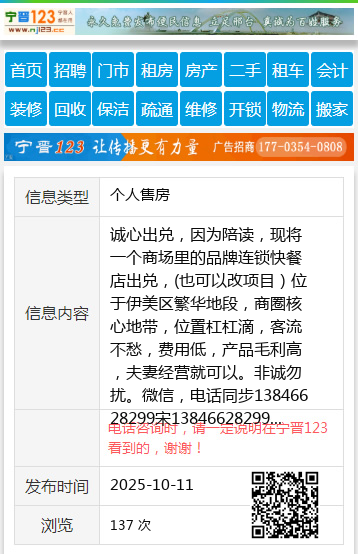诚心出兑,因为陪读,现将一个商场里的品牌连锁快餐店出兑,(也可以改项目)位于伊美区繁华地段,商圈核心地带,位置杠杠滴,客流不愁,费用低,产品毛利高,夫妻经营就可以。非诚勿扰。微信,电话同步13846628299宋13846628299 【电话咨询时,请一定说明在伊春信息网看到的,谢谢!】 |