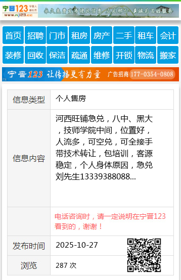 河西旺铺急兑,八中、黑大,技师学院中间,位置好,人流多,可空兑,可全接手带技术转让,包培训,客源稳定,个人身体原因,急兑刘先生13339388088 【电话咨询时,请一定说明在伊春信息网看到的,谢谢!】 |