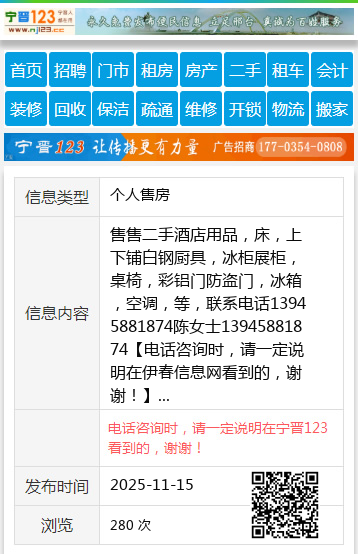 售售二手酒店用品,床,上下铺白钢厨具,冰柜展柜,桌椅,彩铝门防盗门,冰箱,空调,等,联系电话13945881874陈女士13945881874 【电话咨询时,请一定说明在伊春信息网看到的,谢谢!】 |