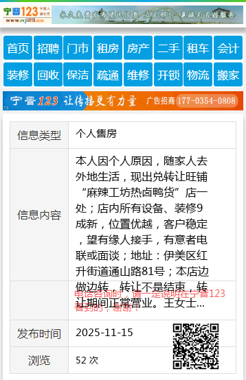 本人因个人原因,随家人去外地生活,现出兑转让旺铺“麻辣工坊热卤鸭货”店一处;店内所有设备、装修9成新,位置优越,客户稳定,望有缘人接手,有意者电联或面谈;地址:伊美区红升街道通山路81号;本店边做边转,转让不是结束,转让期间正常营业。王女士15094574848 【电话咨询时,请一定说明在伊春信息网看到的,谢谢!】 |