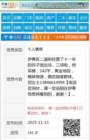 伊春区二道街经营了十一年的饺子馆出兑,三项电,传菜梯,142平,黄金地段,稀缺房源,稳定顾客群体。刘女士13846614994 【电话咨询时,请一定说明在伊春信息网看到的,谢谢!】 |