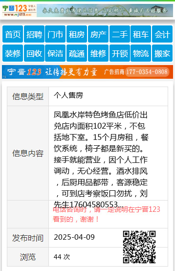 凤凰水岸特色烤鱼店低价出兑店内面积102平米,不包括地下室。15个月房租,餐饮系统,椅子都是新买的。接手就能营业,因个人工作调动,无心经营。酒水排风,后厨用品都带,客源稳定,可到店考察饭口勿扰,刘先生17604580553 【电话咨询时,请一定说明在伊春信息网看到的,谢谢!】 |