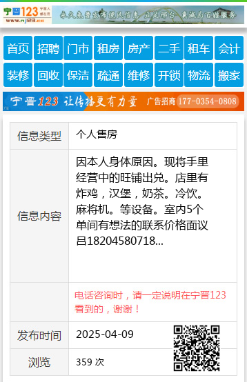 因本人身体原因。现将手里经营中的旺铺出兑。店里有炸鸡,汉堡,奶茶。冷饮。麻将机。等设备。室内5个单间有想法的联系价格面议吕18204580718 【电话咨询时,请一定说明在伊春信息网看到的,谢谢!】 |