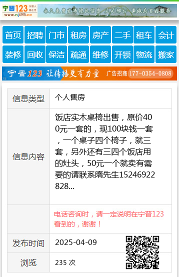 饭店实木桌椅出售,原价400元一套的,现100块钱一套,一个桌子四个椅子,就三套,另外还有三四个饭店用的灶头,50元一个就卖有需要的请联系隋先生15246922828 【电话咨询时,请一定说明在伊春信息网看到的,谢谢!】 |