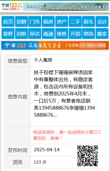 林干校楼下珊珊麻辣烫因家中有事整体出兑,有稳定客源,包含店内所有设备和技术,房费到2025年4月末,一口价5万,有意者电话联系13945888676李珊珊13945888676 【电话咨询时,请一定说明在伊春信息网看到的,谢谢!】 |