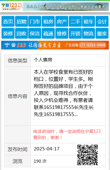 本人在学校食堂有已签好的档口,位置好,学生多。刚刚签好的品牌项目,由于个人原因,现寻找合作伙伴,投入少机会难得,有意者请联系16519817555长先生长先生16519817555 【电话咨询时,请一定说明在伊春信息网看到的,谢谢!】 |