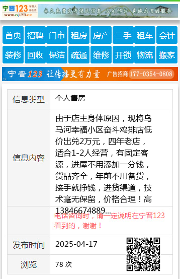 由于店主身体原因,现将乌马河幸福小区奋斗鸡排店低价出兑2万元,四年老店,适合1-2人经营,有固定客源,进屋不用添加一分钱,货品齐全,年前不用备货,接手就挣钱,进货渠道,技术毫无保留,价格合理!高13846674889 【电话咨询时,请一定说明在伊春信息网看到的,谢谢!】 |