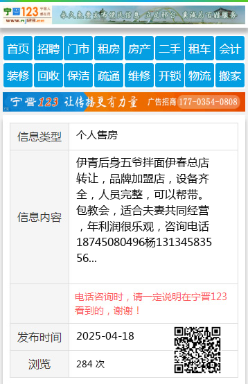 伊青后身五爷拌面伊春总店转让,品牌加盟店,设备齐全,人员完整,可以帮带。包教会,适合夫妻共同经营,年利润很乐观,咨询电话18745080496杨13134583556 【电话咨询时,请一定说明在伊春信息网看到的,谢谢!】 |
