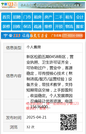 新区松韵五期0458街区,营业执照、卫生许可证齐全,可协助过户,营业中,客源稳定,可传授核心技术(熬制汤底/配方/运营经验)设备齐全,带技术教学,支持短期带店交接,上手即盈利,收益稳定。个人发展原因,忍痛转让优质资源。电话:15636400808(微信同号);看店时间:随时预约,非诚勿扰。张先生15636400808 【电话咨询时,请一定说明在伊春信息网看到的,谢谢!】 |
