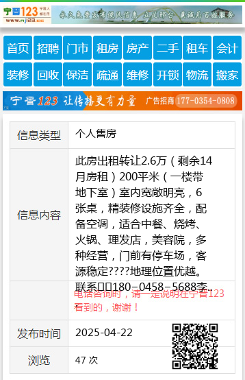 此房出租转让2.6万(剩余14月房租)200平米(一楼带地下室)室内宽敞明亮,6张桌,精装修设施齐全,配备空调,适合中餐、烧烤、火锅、理发店,美容院,多种经营,门前有停车场,客源稳定????地理位置优越。联系☎️180−0458−5688李女士18004585688 【电话咨询时,请一定说明在伊春信息网看到的,谢谢!】 |