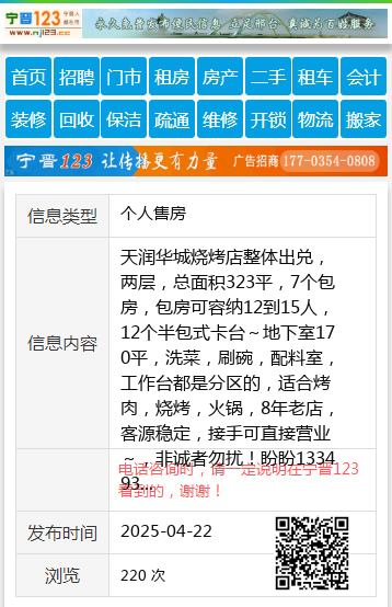 天润华城烧烤店整体出兑,两层,总面积323平,7个包房,包房可容纳12到15人,12个半包式卡台~地下室170平,洗菜,刷碗,配料室,工作台都是分区的,适合烤肉,烧烤,火锅,8年老店,客源稳定,接手可直接营业~,非诚者勿扰!盼盼13349388833 【电话咨询时,请一定说明在伊春信息网看到的,谢谢!】 |