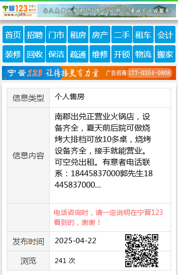 南郡出兑正营业火锅店,设备齐全,夏天前后院可做烧烤大排档可放10多桌,烧烤设备齐全,接手就能营业。可空兑出租。有意者电话联系:18445837000郭先生18445837000 【电话咨询时,请一定说明在伊春信息网看到的,谢谢!】 |