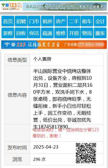 半山国际营业中烧烤店整体出兑,设备齐全,房租到10月31日,营业面积二层共160平方米,双洗手间下水,8张桌椅,即将烧烤旺季,无缝衔接,新手小白也可轻松上手,因工作变动,无暇经营,低价出兑,非诚勿扰先生18745817890 【电话咨询时,请一定说明在伊春信息网看到的,谢谢!】 |