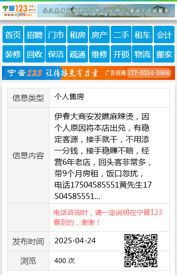 伊春大商安发瞧麻辣烫,因个人原因将本店出兑,有稳定客源,接手就干,不用添一分钱,接手稳赚不赔,经营6年老店,回头客非常多,带9个月房租,饭口忽扰,电话17504585551黄先生17504585551 【电话咨询时,请一定说明在伊春信息网看到的,谢谢!】 |
