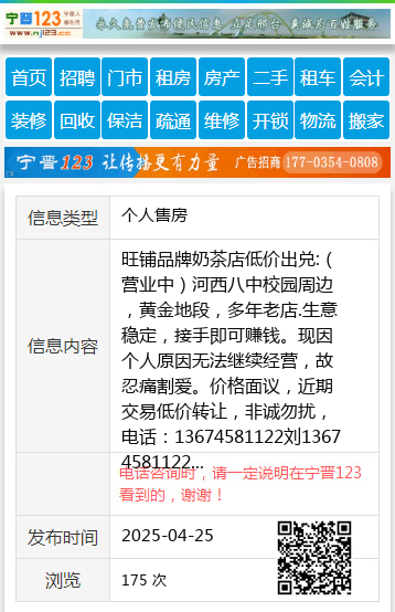 旺铺品牌奶茶店低价出兑:(营业中)河西八中校园周边,黄金地段,多年老店.生意稳定,接手即可赚钱。现因个人原因无法继续经营,故忍痛割爱。价格面议,近期交易低价转让,非诚勿扰,电话:13674581122刘13674581122 【电话咨询时,请一定说明在伊春信息网看到的,谢谢!】 |