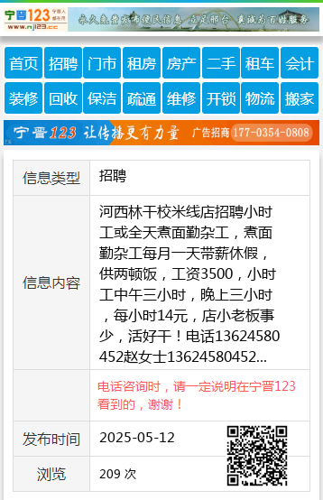 河西林干校米线店招聘小时工或全天煮面勤杂工,煮面勤杂工每月一天带薪休假,供两顿饭,工资3500,小时工中午三小时,晚上三小时,每小时14元,店小老板事少,活好干!电话13624580452赵女士13624580452 【电话咨询时,请一定说明在伊春信息网看到的,谢谢!】 |