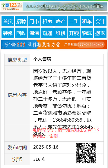 因岁数以大,无力经营,现将经营了三十多年的二百货老字号大饼子店对外出兑,地点好,老顾客多,一年能挣二十多万,无虚假,可实地考察,非诚勿扰!地点:二百货跳骚市场彩票站隔壁,电话:13664580359,联系人:苑先生苑先生13664580359 【电话咨询时,请一定说明在伊春信息网看到的,谢谢!】 |