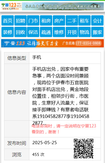 手机店出兑,因家中有重要急事,两个店面没时间兼顾,现将位于伊春市五官医院对面手机店出兑,黄金地段位置佳,相邻步行街,市医院,生意好人流量大,保证接手即赚钱?有意者电话联系19104582877李19104582877 【电话咨询时,请一定说明在伊春信息网看到的,谢谢!】 |