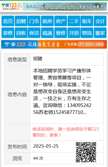 本地招聘学员学习产康形体管理、美容美雕等项目,一对一指导,现场实操,不论是想改变自身还是想改变生活,一技之长,方有生存之道。咨询微信:13409524256苏老师15245877710 【电话咨询时,请一定说明在伊春信息网看到的,谢谢!】 |