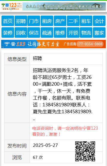 招聘洗浴男服务生2名,年龄不超过65岁男士,工资2600+满勤200+提成,活不累,干一天,休一天,有免费工作餐,名额有限。联系电话:13845819809联系人:夏先生夏先生13845819809 【电话咨询时,请一定说明在伊春信息网看到的,谢谢!】 |
