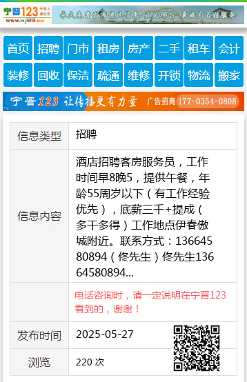 酒店招聘客房服务员,工作时间早8晚5,提供午餐,年龄55周岁以下(有工作经验优先),底薪三千+提成(多干多得)工作地点伊春傲城附近。联系方式:13664580894(佟先生)佟先生13664580894 【电话咨询时,请一定说明在伊春信息网看到的,谢谢!】 |