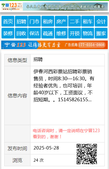 伊春河西彩票站招聘彩票销售员,时间8:30—16:30。有经验者优先,也可培训,年龄40岁以下,工资面议,不招短期。。15145826155 【电话咨询时,请一定说明在伊春信息网看到的,谢谢!】 |