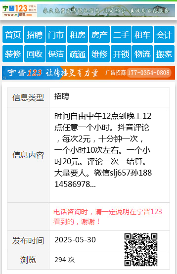 时间自由中午12点到晚上12点任意一个小时。抖音评论,每次2元,十分钟一次,一个小时10次左右。一个小时20元。评论一次一结算。大量要人。微信slj657孙18814586978 【电话咨询时,请一定说明在伊春信息网看到的,谢谢!】 |