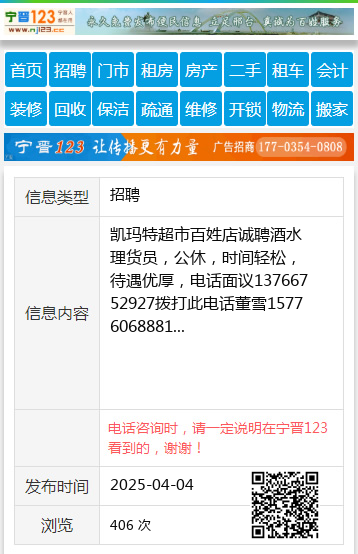凯玛特超市百姓店诚聘酒水理货员,公休,时间轻松,待遇优厚,电话面议13766752927拨打此电话董雪15776068881 【电话咨询时,请一定说明在伊春信息网看到的,谢谢!】 |