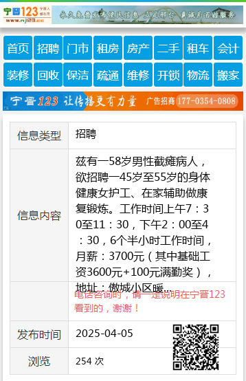兹有一58岁男性截瘫病人,欲招聘一45岁至55岁的身体健康女护工、在家辅助做康复锻炼。工作时间上午7:30至11:30,下午2:00至4:30,6个半小时工作时间,月薪:3700元(其中基础工资3600元+100元满勤奖),地址:傲城小区暖阳13194583030 【电话咨询时,请一定说明在伊春信息网看到的,谢谢!】 |