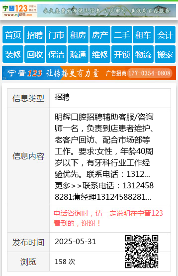 明辉口腔招聘辅助客服/咨询师一名,负责到店患者维护、老客户回访、配合市场部等工作。要求:女性,年龄40周岁以下,有牙科行业工作经验优先。联系电话:1312...更多>>联系电话:13124588281蒲经理13124588281 【电话咨询时,请一定说明在伊春信息网看到的,谢谢!】 |