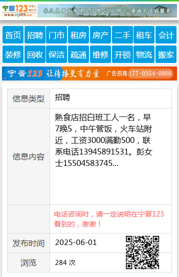熟食店招白班工人一名,早7晚5,中午管饭,火车站附近,工资3000满勤500,联系电话13945891531。彭女士15504583745 【电话咨询时,请一定说明在伊春信息网看到的,谢谢!】 |