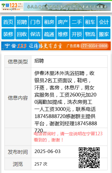 伊春沐里沐外洗浴招聘,收银员2名工资面议,鞋吧,汗蒸,客房,休息厅,男女宾服务员,工资2600元加200满勤加提成,洗衣房男工一人工资3000元,联系电话18745888720感谢群主提供平台,谢谢刘经理18745888720 【电话咨询时,请一定说明在伊春信息网看到的,谢谢!】 |