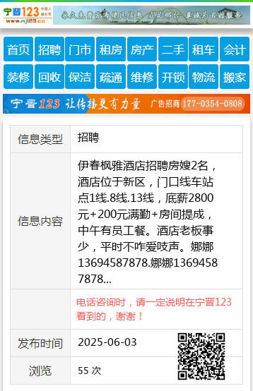 伊春枫雅酒店招聘房嫂2名,酒店位于新区,门口线车站点1线.8线.13线,底薪2800元+200元满勤+房间提成,中午有员工餐。酒店老板事少,平时不咋爱吱声。娜娜13694587878.娜娜13694587878 【电话咨询时,请一定说明在伊春信息网看到的,谢谢!】 |